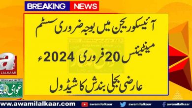 آئیسکو ریجن میں بوجہ ضروری سسٹم مینٹیننس 20فروری 2024ء عارضی بجلی بندش کا شیڈول جاری