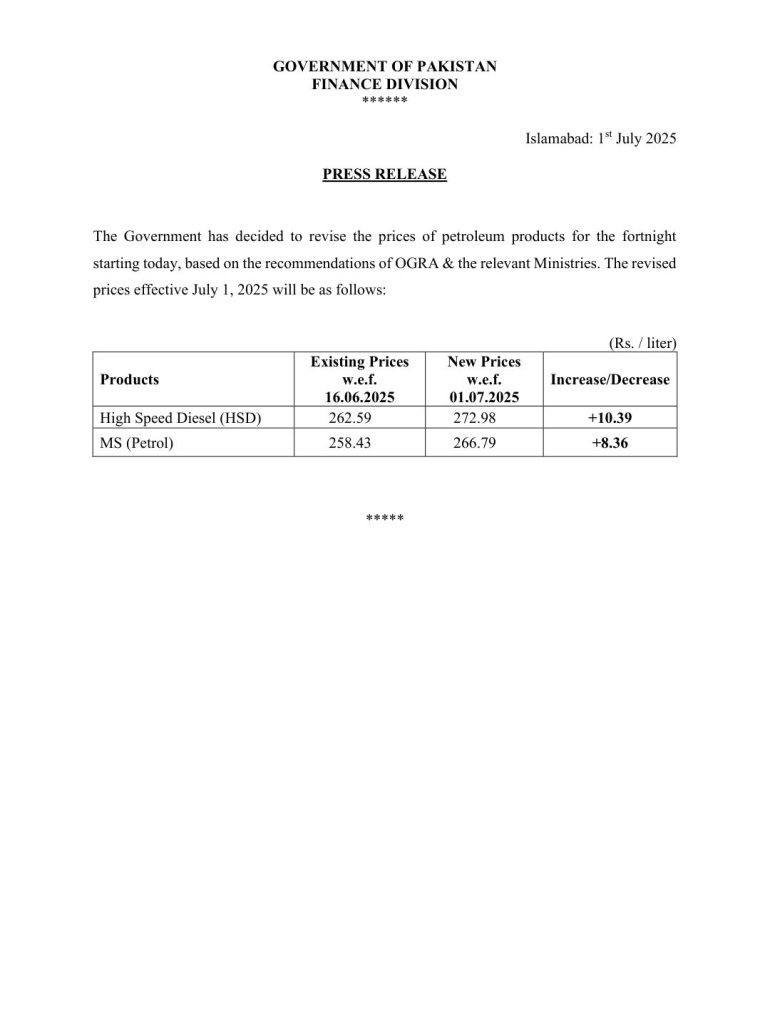 وفاقی وزارت خزانہ نے یکم جولائی 2025 سے پٹرولیم مصنوعات کی نئی قیمتوں کا اعلان کر دیا ہے۔ اوگرا (OGRA) اور متعلقہ وزارتوں کی سفارشات کی روشنی میں حکومت نے آئندہ پندرہ روز کے لیے پٹرول اور ڈیزل کی قیمتوں میں نمایاں اضافہ کر دیا ہے۔