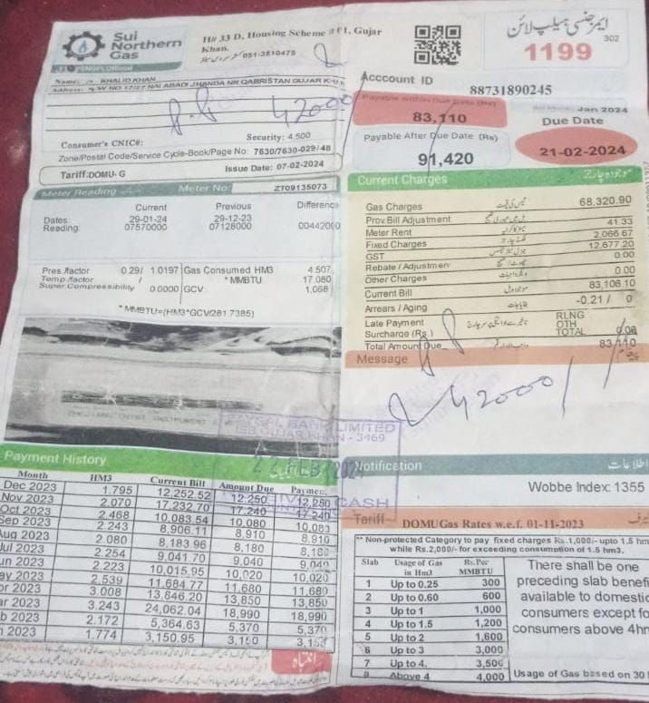 جو ان خاندانوں کے لئے عذاب سے کم نہیں شہری گھر کا سامان اور دیگر قیمتی اشیاء فروخت کرکے بل بھرنے پر مجبور مرد و خواتین سوئی گیس دفاتر کے چکر لگا رہے ہیں جبکہ عملہ کی جانب سے مناسب قسطوں کا بھی کوئی شیڈول نہیں اور بل جمع نہ ہونے پر ہزاروں روپے جرمانہ اضافہ ہوجائے گا گوجرخان کے رہائشی فروٹ کا ٹھیلہ لگانے والے نصراللہ خان جسکا پچھلے ماہ 12 ہزار بل آیا تھا اس مہینے اسکو گھر کا گیس کا بل 83ہزار روپے موصول جسکو دیکھ کر غریب کے رونگٹے کھڑے ہو گے غریب نے گیس دفتر کے چکر لگائے انھوں نے کہا کہ اسکا کوئی حل نہیں ہو سکتا بل جمع کروانا پڑے گا بڑی مشکل سے اڑھتیوں کے پیسے رکھ اور اور دیگر سے ادھار پکڑ کر رقم مینج کرکے دو اقساط کروائی تو رہتی کسر بنک والوں نے نکال دی کہ اپکا یہ بل یہاں جمع نہیں ہو گا راولپنڈی جاکر جمع کرواو متاثرہ شہری اور دیگر نے چیف جسٹس آف پاکستان سے اس تمام تر صورتحال پر سختی سے نوٹس لینے کا مطالبہ کرتے ہوئے کہا کہ اس ظلم سے عوام کو نجات دلوائی جائے ہم مزدور لوگ پہلے ہی مہنگائی کی چکی میں پس رہے پہلے ایک طرف گرمیوں میں بجلی کے بلوں کا عذاب دوسری جانب سردیوں میں محکمہ سوئی سدرن گیس نے بھی ہم پر قہر ڈھا دیا ہے ہم لوگ دو وقت کی روٹی بمشکل پوری نہیں کر پا رہے ہیں نوبت فاقہ کشی تک پہنچ چکی ہے بجلی گیس کے بھاری بھرکم بل جمع کروائیں یا بیوی بچوں کو پالیں خدارا ہمارے حال پر رحم کیا جائے اور غریب دیہاڑی دار متواسط طبقے کو ریلیف فراہم کروایا جائے