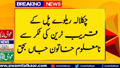 راولپنڈی (عبدالرحمان سے) چکلالہ ریلوے پل کے قریب ٹرین کی ٹکر سے ایک نامعلوم خاتون جاں بحق ہو گئی۔ ریسکیو…