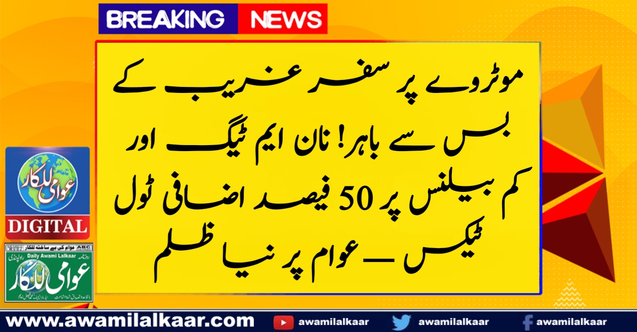 عوام پہلے ہی مہنگائی، بے روزگاری، اور بجلی کے بلوں تلے دبے جا رہے تھے، اب حکومت نے موٹرویز پر سفر کرنے والوں پر بھی ٹول ٹیکس کے بم گرا دیے۔ نیشنل ہائی وے اتھارٹی (NHA) نے نان ایم ٹیگ اور کم بیلنس والی گاڑیوں پر 50 فیصد اضافی ٹول ٹیکس مسلط کر دیا۔ گویا جو ایم ٹیگ نہیں رکھتا، وہ صرف گاڑی نہیں چلا رہا — “جرم” کر رہا ہے!